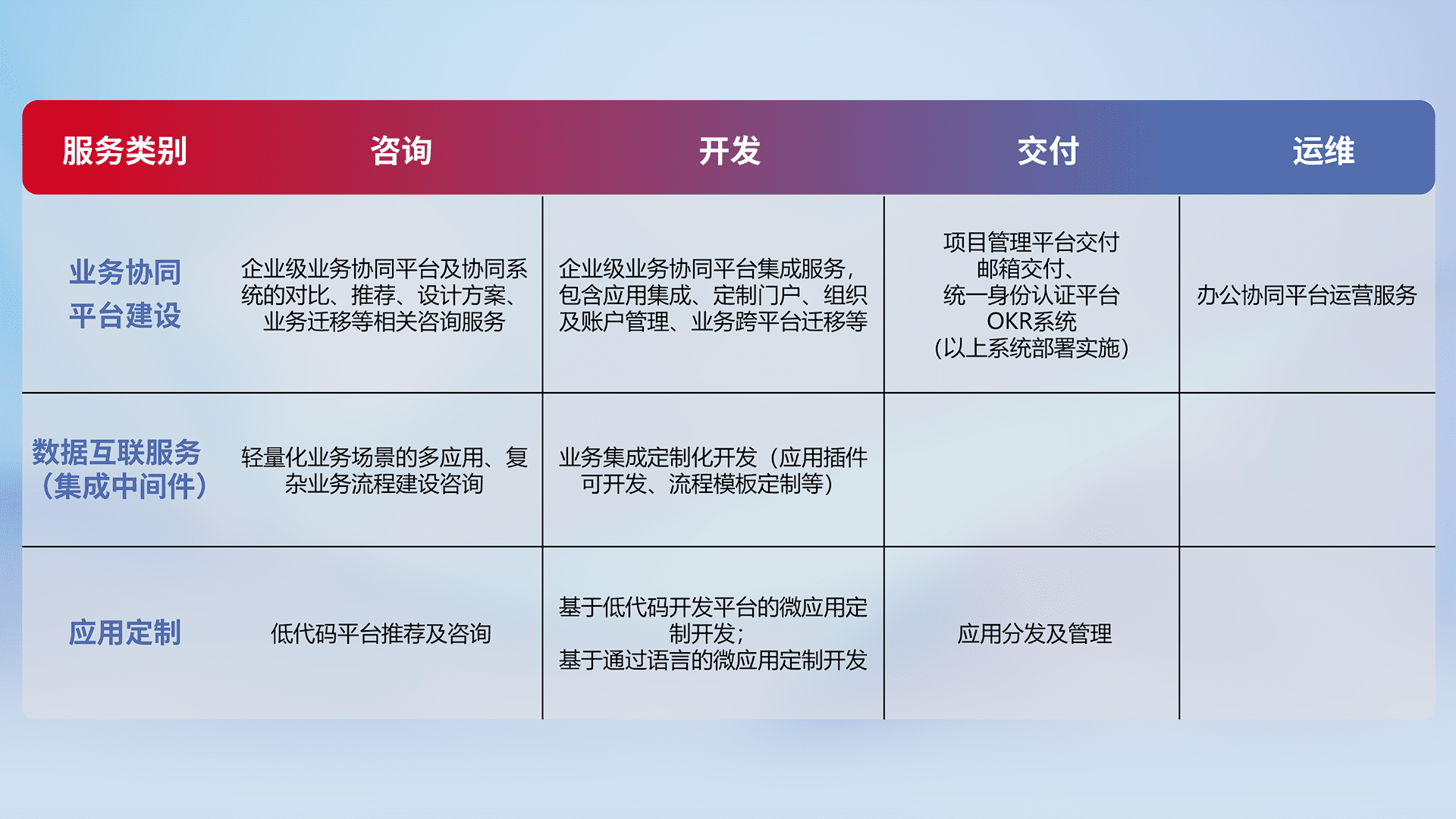 针对钉钉、、企微、、IDaas等平台级产品提供产品的规划、、、方案、、、、交付、、定制化开发等服务,,实现如统一协同办公、、、智能客户服务、、、混合会议管理、、、、智能数据查询、、等业务场景,,实现数字化转型。。。